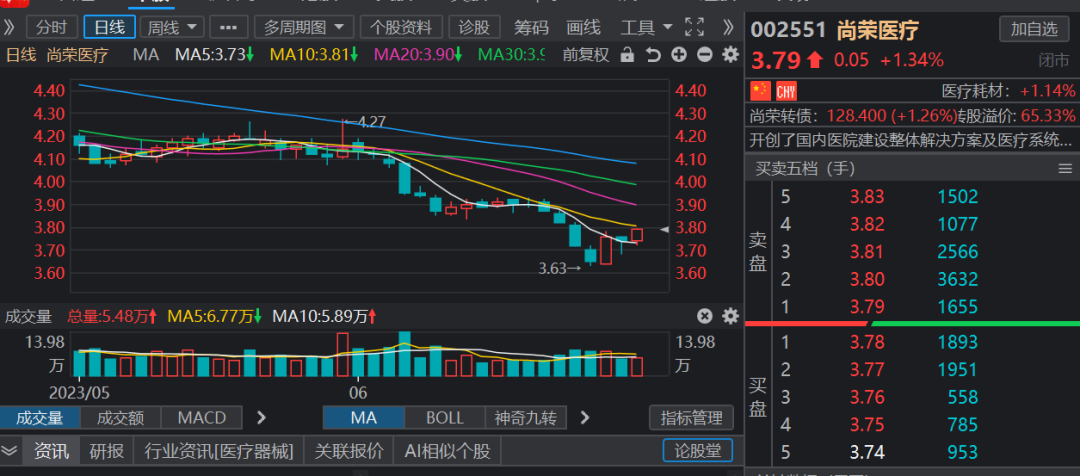 截至2023年6月29日收盘,尚荣医疗报3.79元/股,涨1.34%,总市值32.02亿元。在资金流向数据方面,截至29日收盘,主力资金净流出104.21万元,占总成交额5.04%,游资资金净流入0.01万元,散户资金净流入104.2万元,占总成交额5.04%。
