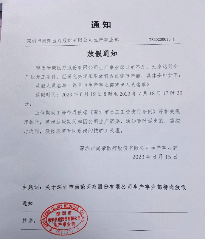 为何尚荣医疗会曝出“停工”?原来是深圳生产事业部的一纸《放假通知》流传于市。《放假通知》显示,尚荣医疗的生产事业部因订单不足,无法达到全厂线开工条件,经研究决定采取放假方式调节产能,放假时间为6月19日至7月18日17时30分。放假期间工资待遇依据《深圳市员工工资支付条例》等相关规定执行,待岗放假期间如因公司生产需要,通知暂时返岗的,需按时返岗,否则按旷工处理。该通知落款日期为6月15日,并盖有“深圳市尚荣医疗股份有限公司生产事业部”的公章。