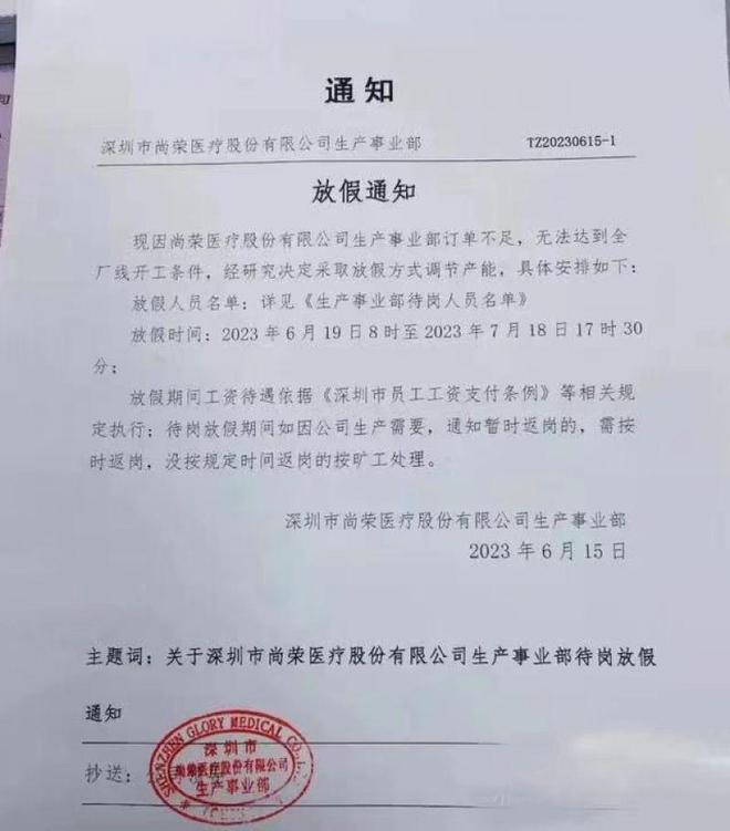 该通知称,现因尚荣医疗生产事业部订单不足,无法达到全厂线开工条件,经研究决定采取放假方式调节产能,放假时间为6月19日8时至7月18日17时30分。该通知落款为深圳市尚荣医疗股份有限公司生产事业部,落款日期为6月15日,通知上还盖有其印章。
