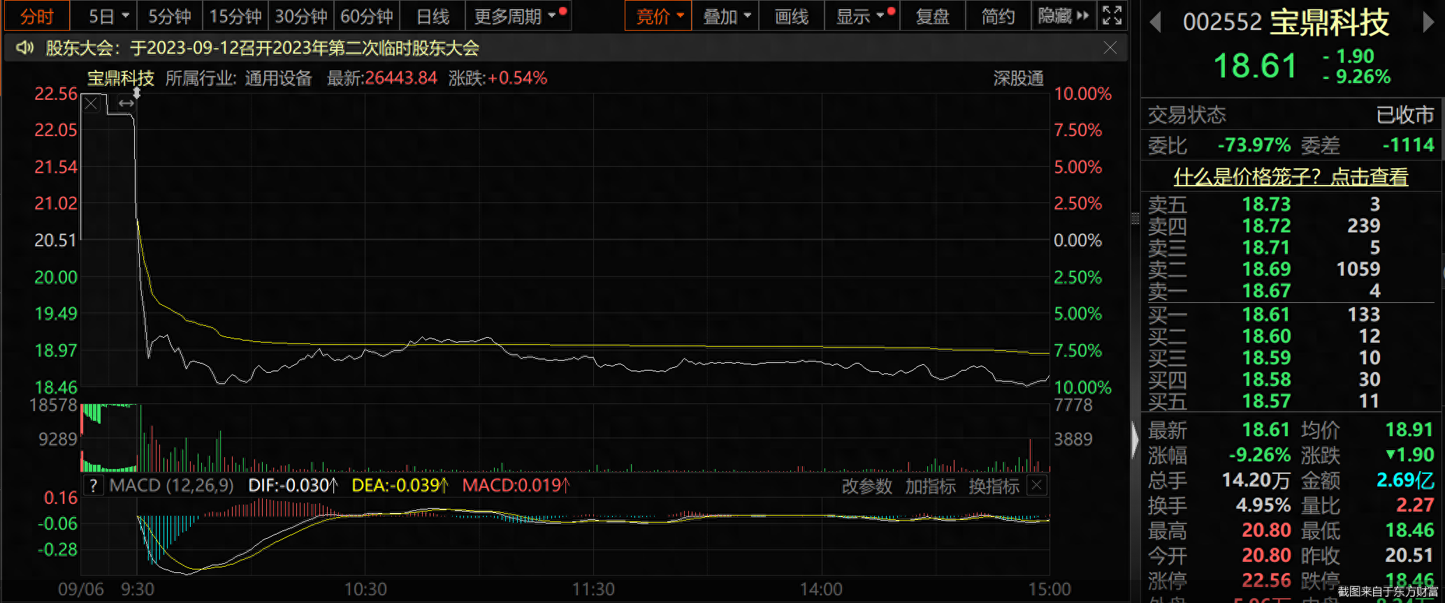 交易行情显示,9月6日,宝鼎科技高开1.41%,开盘价为20.8元/股,开盘后宝鼎科技股价迅速跳水,盘中一度触及跌停,截至当日收盘报18.61元/股,跌幅为9.26%,总市值为79.64亿元,全天成交金额为2.69亿元,换手率为4.95%。