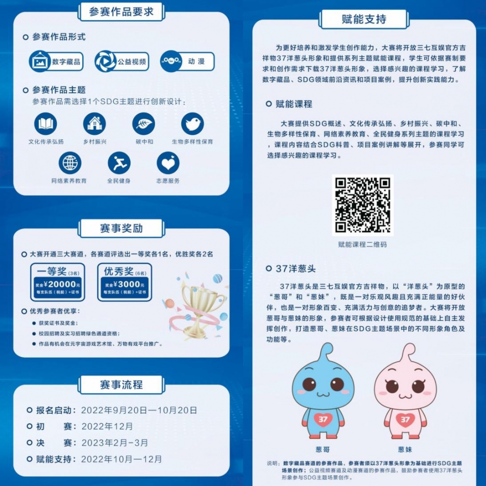此外,为更好培养和激发学生创作能力,SDG大赛将开放三七互娱官方吉祥物37洋葱头形象作为素材,供选手进行作品创作。同时,三七互娱还将开放可持续发展相关赋能课程,参赛选手可选择感兴趣的课程学习,了解数字藏品、SDG领域前沿资讯和项目案例,提升创新实践能力。