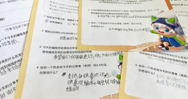 课程结束后,孩子们大开脑洞,在活动分享卡中“畅所欲言”。有的孩子记录了自己的创意想法,想用编程做一个卡片,画上国旗写下十一贺词;有的孩子写下祝福:希望我们国家更好,航天科技更上一层楼.....