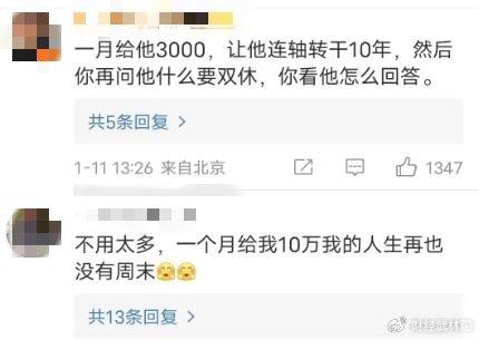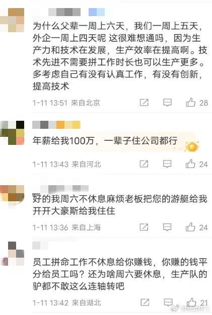 网民们纷纷表示:“一月给他3000,让他连轴干10年,然后你再问他为什么要双休,你看他怎么回答”、“不用太多,一个月给我10万,我的人生再也没有周末”、“问问钱给够了吗就同舟共济”、“年薪给我100万,一辈子住公司都行”……