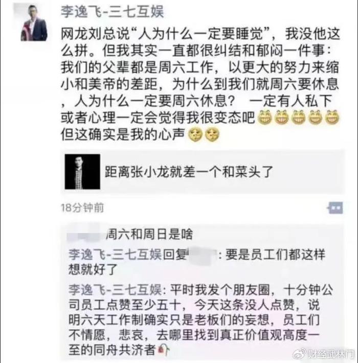 在这条评论区下方,李逸飞还进一步评论道:“平时我发个朋友圈,十分钟公司员工点赞至少五十,今天这条没人点赞,说明六天工作制确实只是老板们的妄想,员工们不情愿,悲哀,去哪里找到真正价值观高度一致的同舟共济者。”