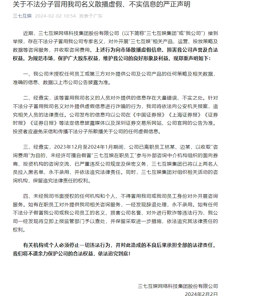 三、经查实,2023年12月至2024年1月期间,公司已离职员工林某、边某,以收取“咨询费用”为目的,未经许可擅自假冒“三七互娱在职员工”参与外部咨询中介机构组织的面向券商、投资机构的咨询交流,已严重违反公司规定及保密义务,三七互娱集团已将以上两名人员拉入黑名单、永不录用,并依法追究法律责任。同时,三七互娱集团对组织相关活动的咨询机构,保留追究法律责任的权利。