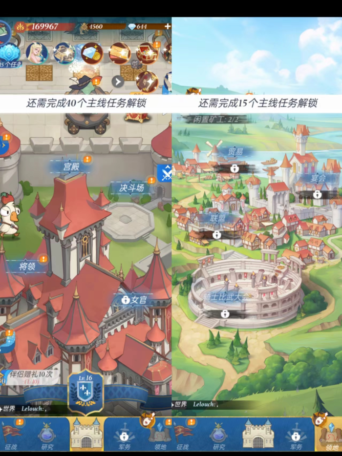 此外,随着主线任务推进,游戏玩法逐渐解锁,则会发现这款产品中还融入了RPG游戏和SLG游戏中常见的玩法,比如升级到男爵后可解锁宫殿场景,其中包括伴侣和幼兽(宠物),(还有笔者尚未解锁到的“女官”系统,预测应该也是养成),二者不仅外形不错,还能提供暴击、抵抗加成等不同buff,给RPG玩家和收集癖用户提供了一个留存点。