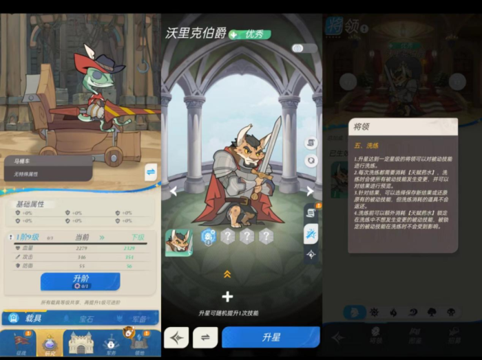 战斗过程中,《Fur The Empire》目前支持超过4名英雄助战(包括玩家角色)和两个城墙武器(弩箭)协战,弩箭升级可以获得冰、火、毒等不同属性,并且提升攻击范围和攻击速度等,在关卡内升级即可并不需要特别培养。玩家操控的弩炮车和共战英雄则需要玩家进行相对深度的养成,比如通过弩炮升阶和镶嵌宝石、为载具添加特殊属性;通过英雄升阶、技能升星来增强英雄总战力,在升星达到一定星级后,还可以对英雄的被动技能进行洗练,确保洗练结果需要消耗额外的天赋药水,养成方面整体类似于MMO游戏,而这一设计的长线吸金能力也早已在《菇勇者传说》中得到了验证。