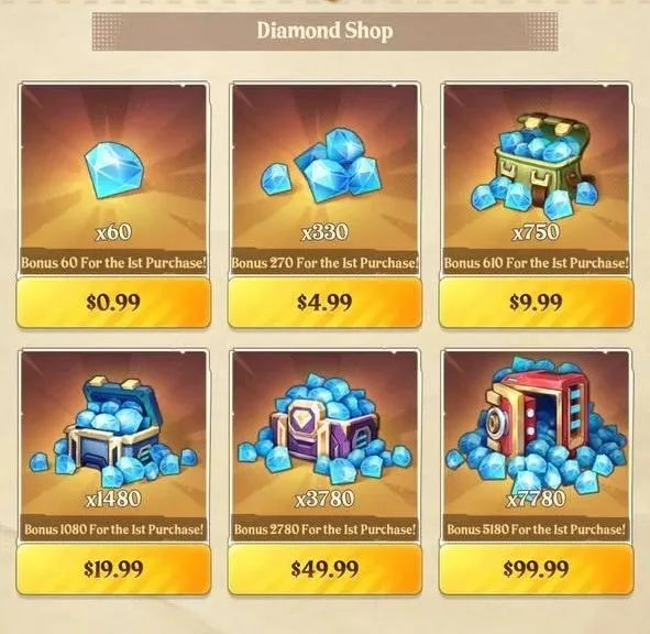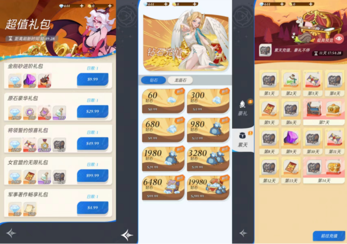 从氪金礼包定价和利润角度换算来看,其多以0.99美元、4.99美元和9.99美元的低价套餐吸引微氪用户尝鲜(主推9.99美元750钻,利润为24%),中间价礼包为19.99美元1480钻石,其利润仅为22%,49.99美元和99.99美元的高价礼包利润则均超过25%。