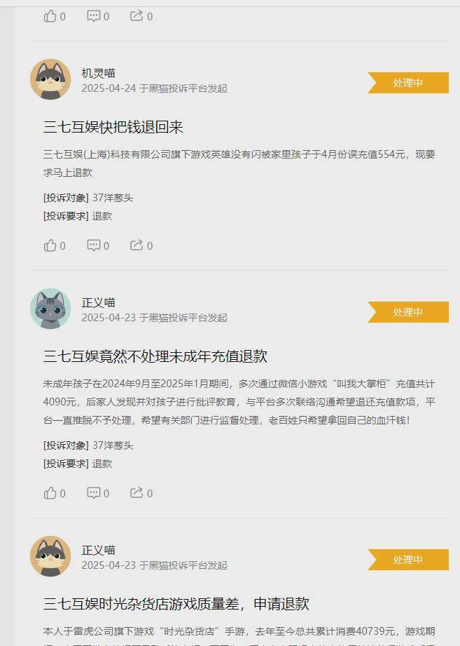 在社会责任担当与游戏服务质量方面,三七互娱也深陷舆论漩涡。未成年充值退款问题上,公司的表现令人失望。有家长投诉,孩子在2024年9月至2025年1月期间,通过微信小游戏“叫我大掌柜”多次充值共计4090元,家人发现后与平台多次沟通退款,平台却一直推脱不予处理。