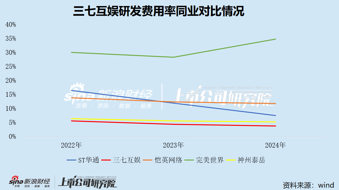 此外,三七互娱研发人员持续流失。2022年至2024年,三七互娱研发人员数量分别为1654人、1471人、1318人,同比减少15.48%、11.06%、10.40%,占员工总数的比例从46.57%下降至40.57%。同期,ST华通的研发人员数量稳定在2200人水平,员工占比则从37.53%逐年升至39.16%。