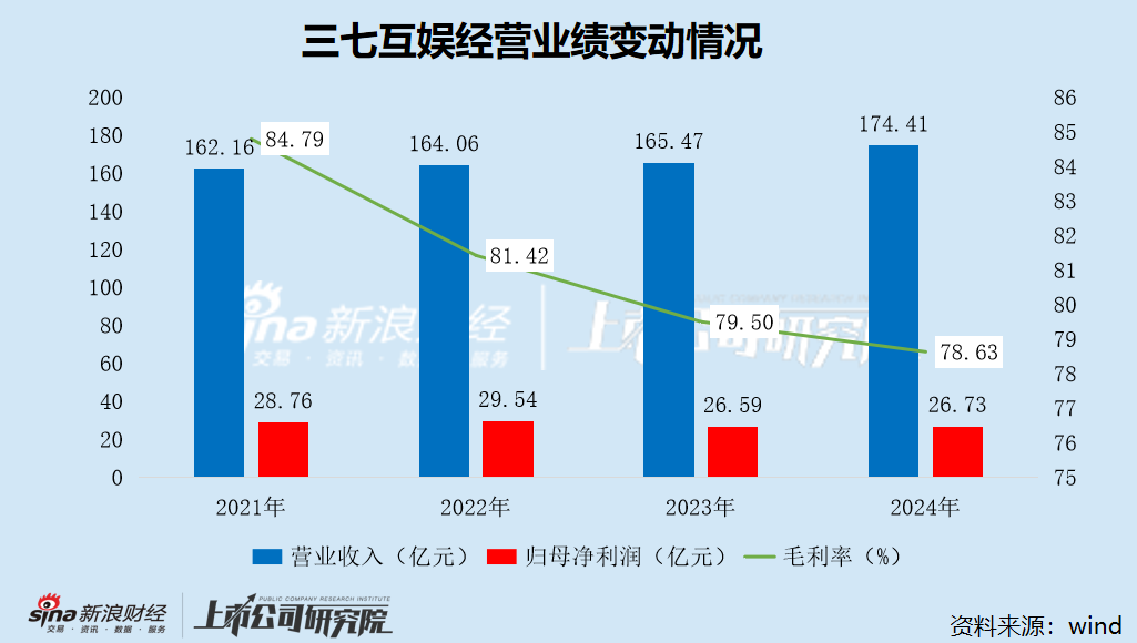 三七互娱全年实现营业收入174.41亿元,虽再创新高,但增速显著掉队;归母净利润26.73亿元,与上年同期持平。