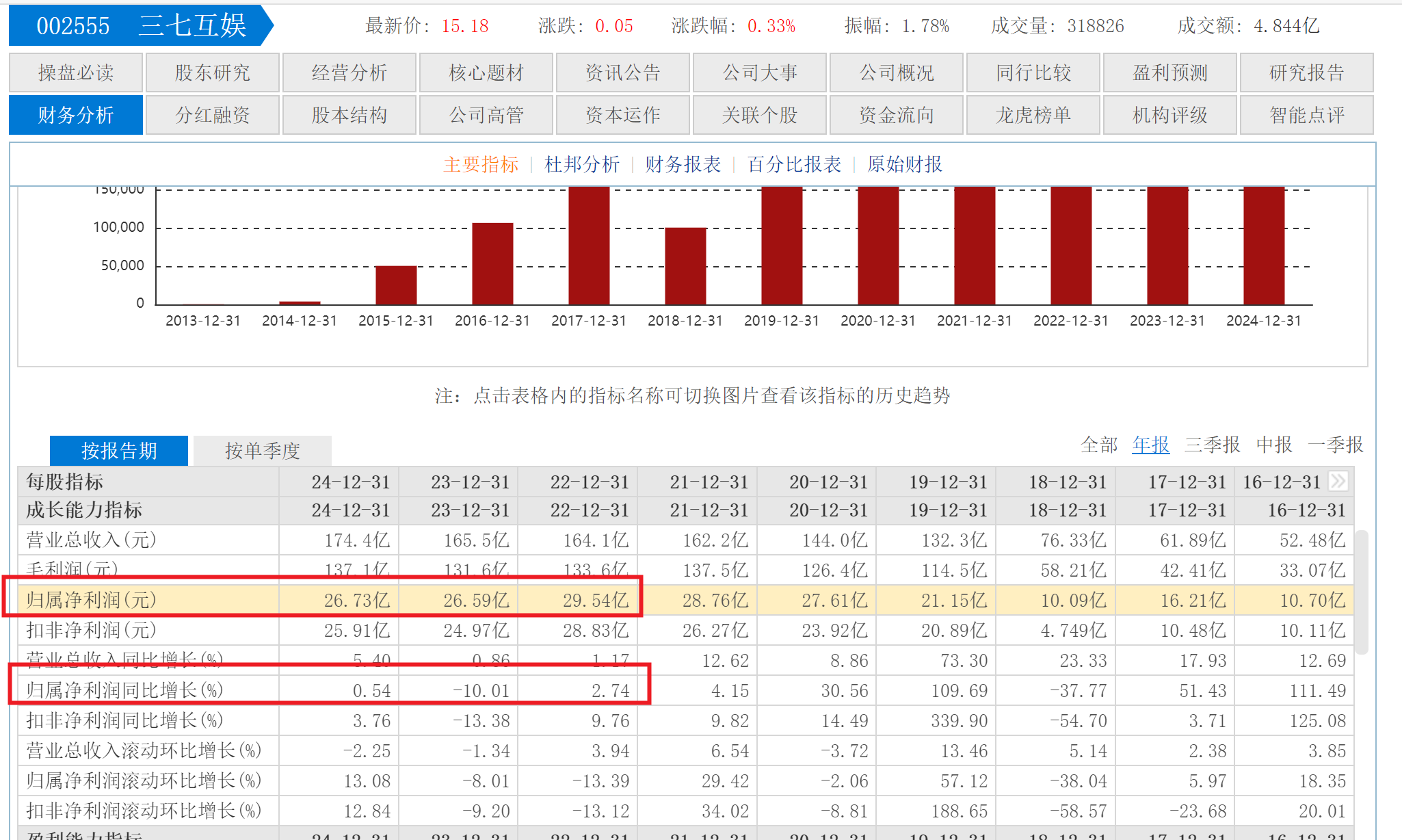 三七互娱的2024年业绩报告显示,报告期内,该公司实现营业收入174.41亿元,虽再创新高,但增速显著掉队;归母净利润26.73亿元,与上年同期几乎持平。