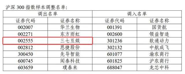 沪深300指数调整样本,三七互娱遭剔除引发市场关注