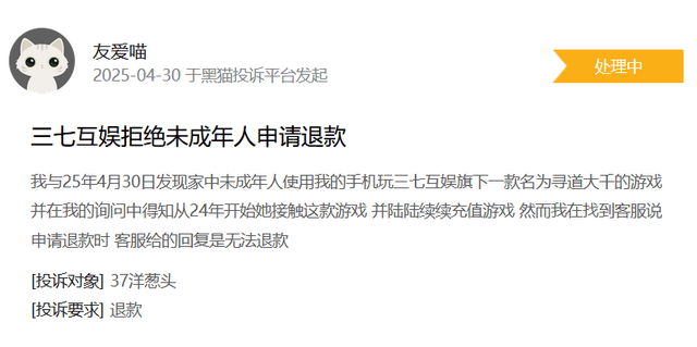 除了业绩和分红问题外,三七互娱还面临着社会责任与游戏服务质量方面的争议。在黑猫投诉平台上,有家长投诉家中未成年人玩三七互娱旗下游戏拒绝申请退款,以及游戏存在系统卡顿、不平衡、外挂等问题未得到解决。这些问题不仅影响了公司的品牌形象,也对公司的长期发展构成了潜在威胁。