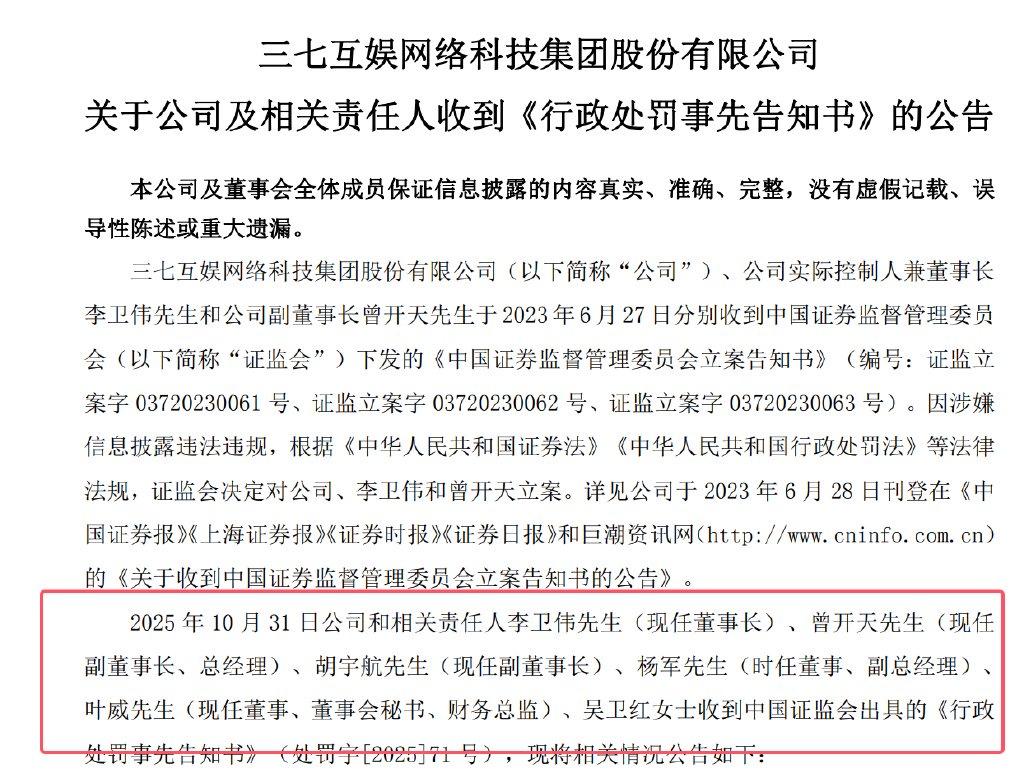 三七互娱及相关责任人(李卫伟、曾开天等)因 2023 年 6 月被证监会立案调查的信息披露违法违规事项,于 2025 年 10 月 31 日收到《行政处罚事先告知书》。
