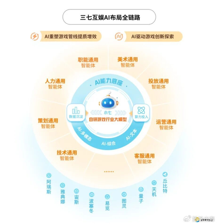 “游戏是AI技术应用的最佳场景”,三七互娱副总裁朱怀敏曾在接受媒体采访时说道。在这一认知指导下,三七互娱采用了“自研+投资+合作”的AI布局策略。在内部研运管线中,为了实现降本增效、全面提升公司的游戏研运工业化水平,三七互娱研发了自己的游戏行业垂直大模型“小七”,并且引入了外部大模型集群,以“小七”为底座构建了40多种AI能力,开发了图灵、量子、天机、易览、丘比特、宙斯、雅典娜、阿瑞斯、波塞冬等一系列自动化工具。