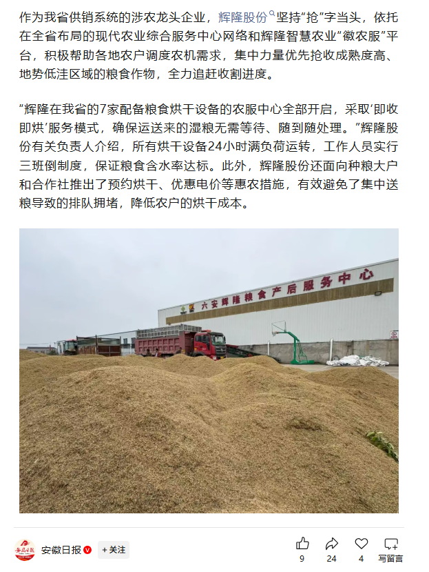 金秋十月,沃野千里。面对安徽等地持续性阴雨天气,《安徽日报》近日对安徽省秋粮抢收情况进行综合报道,辉隆股份秋收工作受到日报关注报道。