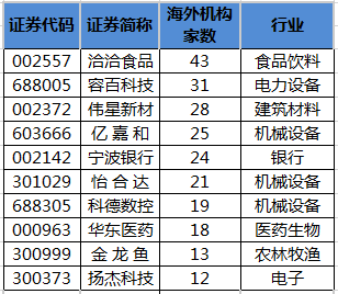 数据宝统计显示,近10个交易日(1月4日至1月17日),海外机构对84家上市公司进行调研。其中,洽洽食品最受关注,参与调研的海外机构达到43家;容百科技、伟星新材、亿嘉和参与调研的海外机构分别有31家、28家、25家。