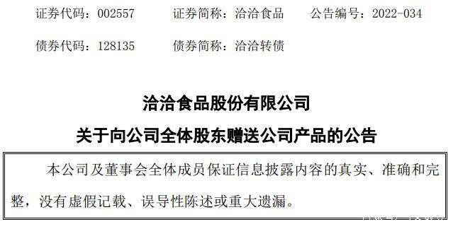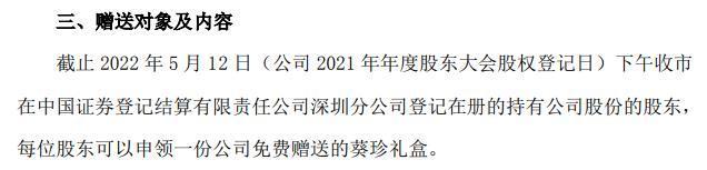 洽洽食品公告明确宣布:凡在2022年5月12日下午收市登记在册的持股公司股份的股东,每位股东可以申领一份公司免费赠送的葵珍礼盒。从这一规定可以看出,每位股东,无论持股数量多少,均只能申领一份,这表明股东获得的礼盒数量和金额与其持股多少无关。因此,这不能归为实物分红行为,而只能算是捐赠行为。