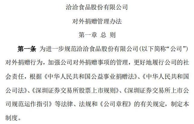洽洽食品公司在公告中明确此次赠送行为是依据公司的《对外捐赠管理办法》进行的,但是仔细对照该《办法》的相关规定,要将向股东赠送自产产品归为对外捐赠,还是存在以下疑问: