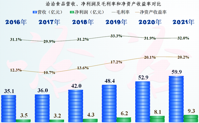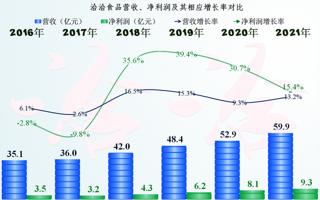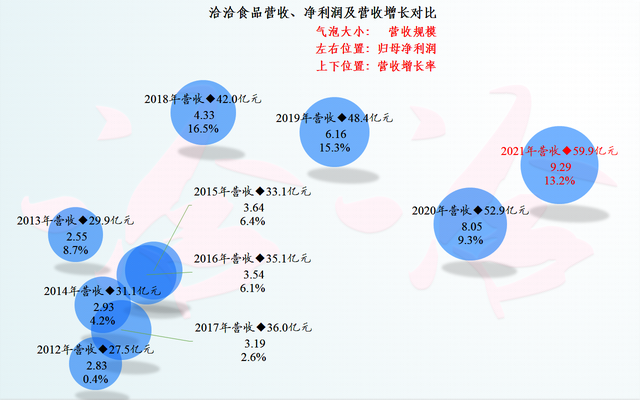 显然是我估计错了,从气泡图来看,洽洽食品的营收近几年还在不停地创下新纪录,净利润也是芝麻开花节节高,特别是2020和2021年,基本没有受到疫情的影响,延续了2018年以来的营收和净利润的双双增长,只是在营收增长率上已经不如2018、2019年了。