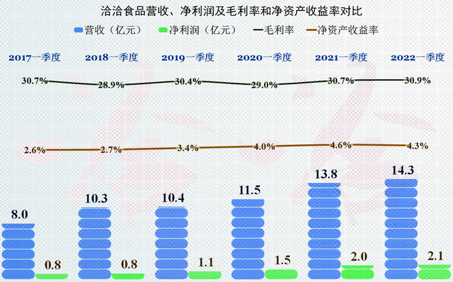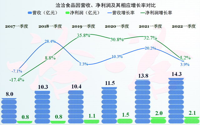 2022年一季度,营收和净利润的同比增长再次下降,已经跌到5%,甚至更低的区间,应该说,洽洽食品的后续经营形势,也并不是全面看好的。