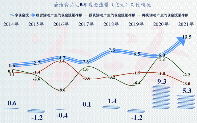 从现金流量表现来看,洽洽食品相当不错,特别是2021年,净利润增长虽然不多,但经营活动产生的净现金流量达到了13.5亿元,同比大幅增长。后面要讲到,存货在营收增长的情况下还能较大幅度下降,这确实不容易做到。