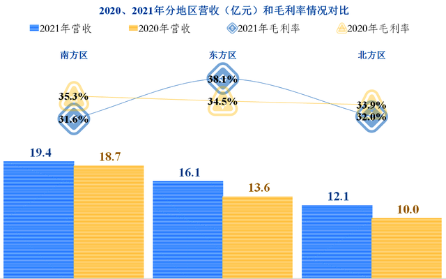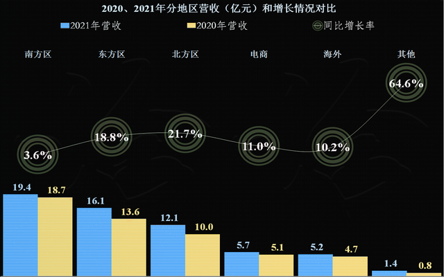 从其分地区的增长来看,在最大的市场“南方区”,仅增长了3.6%,而第二大和第三大市场增长率在20%左右,电商和海外的增长率为10%出头。