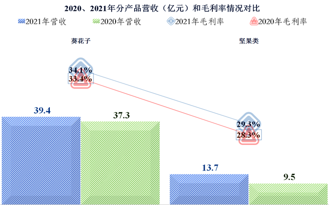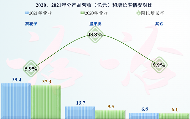 从其分产品的营收增长来看,葵花子,也就是我们所说的瓜子,增长只有5.9%,主要的增长在坚果类食品方面,达到了43.8%。看来产品线丰富一些还是有好处的,如果只有瓜子这一个产品,洽洽食品2021年的业绩表现就要差很多。
