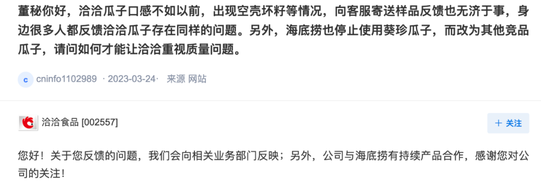 ¡¡¡¡ÁíÒ»·½Ã棬Ͷ×ÊÕß¶Ô¹«Ë¾µÄ¹Ï×ÓÖÊÁ¿Ò²±í´ïÁ˲»Âú¡£ÕâλͶ×ÊÕßÔÚÉî½»Ëù»¥¶¯Ò×·´Ó³£¬Ç¢Ç¢¹Ï×ӿڸв»ÈçÒÔǰ£¬³öÏÖ¿Õ¿Ç»µ×ѵÈÇé¿ö£¬Ïò¿Í·þ¼ÄËÍÑùÆ··´À¡Ò²ÎÞ¼ÃÓÚÊ£¬Éí±ßºÜ¶àÈ˶¼·´À¡Ç¢Ç¢¹Ï×Ó´æÔÚͬÑùµÄÎÊÌâ¡£ÁíÍ⣬º£µ×ÀÌҲֹͣʹÓÿûÕä¹Ï×Ó£¬¶ø¸ÄΪÆäËû¾ºÆ·¹Ï×Ó£¬ÇëÎÊÈçºÎ²ÅÄÜÈÃÇ¢Ç¢ÖØÊÓÖÊÁ¿ÎÊÌâ¡£