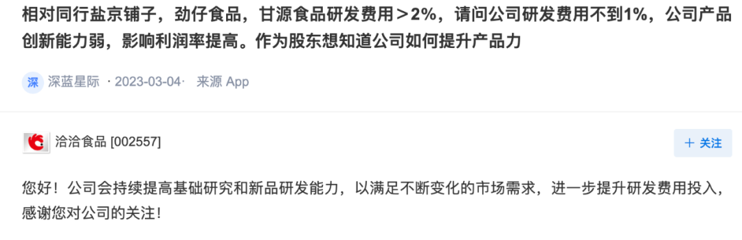 ¡¡¡¡ÔÚ»¥¶¯Ò×ÉÏ£¬ÓÐͶ×ÊÕßÌáÎÊ£ºÏà¶ÔͬÐÐÑνòÆÌ×Ó£¬¾¢×ÐʳƷ£¬¸ÊԴʳƷÑз¢·ÑÓÃÂÊ´óÓÚ2£¥£¬ÇëÎʹ«Ë¾Ñз¢·ÑÓò»µ½1%£¬¹«Ë¾²úÆ·´´ÐÂÄÜÁ¦Èõ£¬Ó°ÏìÀûÈóÂÊÌá¸ß¡£×÷Ϊ¹É¶«ÏëÖªµÀ¹«Ë¾ÈçºÎÌáÉý²úÆ·Á¦¡£