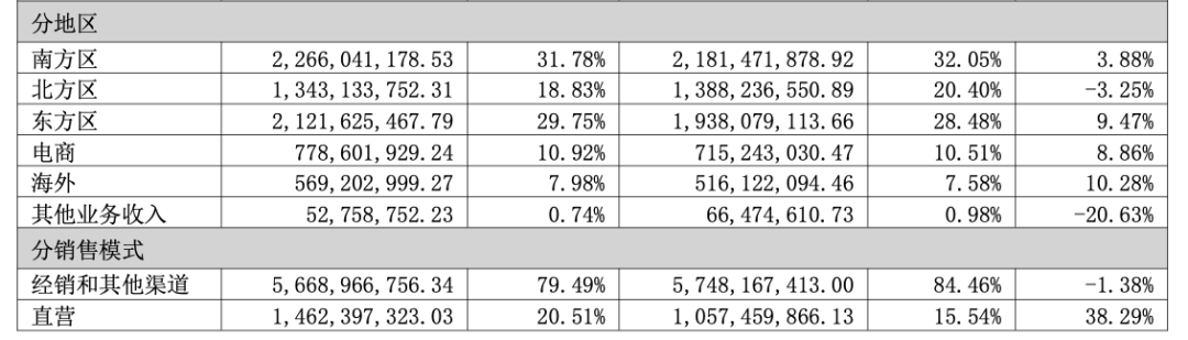 分区域看,南方区、北方区、东方区、电商渠道及海外业务分别实现营收22.7亿元、13.4亿元、21.1亿元、7.8亿元及5.7亿元,同比增长3.9%、-3.3%、9.5%、8.9%及10.3%。