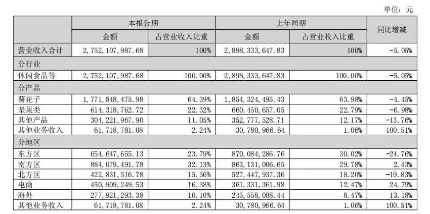 从产品结构看,其半年报披露的分产品营收数据显示,葵花子仍是 洽洽食品 的“基本盘”,上半年实现收入17.72亿元,占总营收的64.39%,营收同比减少4.45%。然而,这一比例与去年同期相比并未显著上升。