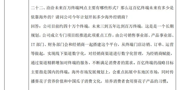 这一战略描绘了从“瓜子王者”迈向休闲食品“平台型企业”的愿景。其中,百万终端战略同样被视为撬动销售规模的杠杆, 洽洽食品 为此专门成立项目组,由销售、产品、IT、财务四大部门联合推进,围绕门店访销、订单处理、渠道服务等环节进行数字化升级。该目标明确指向国内市场,计划通过渠道精耕与经销商赋能,提高覆盖密度并增强对终端用户的响应速度。