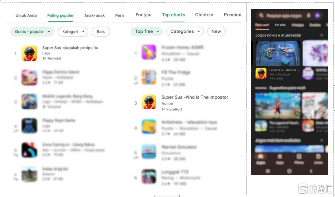 《Super Sus》上线后即占据印尼、马来西亚、巴西等游戏榜Top3、Google Play多次推荐