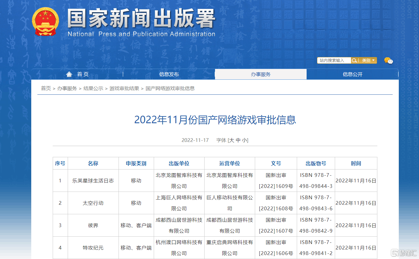 11月17日,国家新闻出版署官网今日公布最新国产网络游戏审批结果,巨人网络旗下自主研发手游《太空行动》通过审批,为国内首个获得版号的太空杀手游。