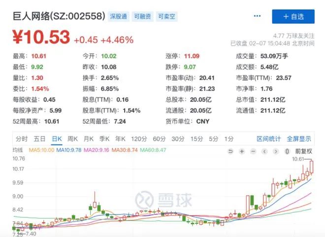 受此影响,巨人网络的股价在最近四个交易日呈较大幅度的上升。截至2月7月收盘,巨人网络股价报收10.53元/股,总市值超211亿元。