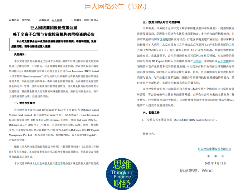 巨人网络表示,全资子公司Giant Investment于2023年5月10日与 DeFiance Liquid Venture Fund Limited(以下简称“DeFiance”)签订《认购协议》,Giant Investment 拟以自有资金出资100万美元认购DeFiance的股份,成为DeFiance的股东。