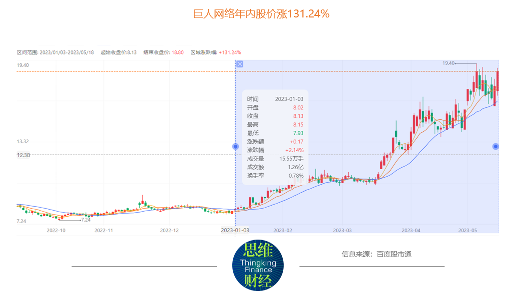 尽管年报和一季报成绩单不算优异,但是在二级市场上,巨人网络自2022年10月以来呈现上行态势,截至今年5月18日,收盘价18.8元/股,较1月3日收盘价8.13元/股,涨幅高达131.24%。