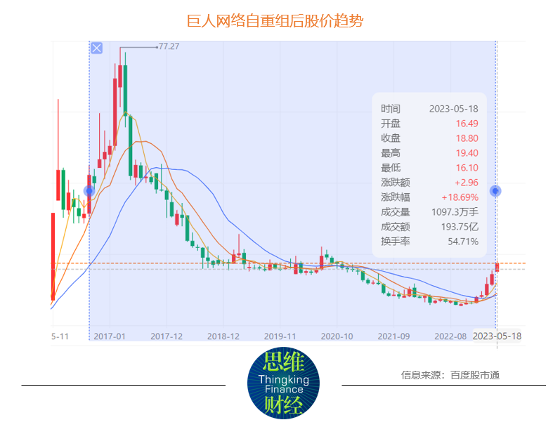 不过,自其2016年重组开始之后,巨人网络股价一度高达77.27元(2017年),此后即在波动中下行,截至5月18日收盘,即便年内翻倍,但相较于历史最高值已经跌去了近8成。