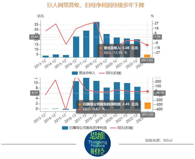拉长时间观察,近年来,巨人网络业绩连续下滑。