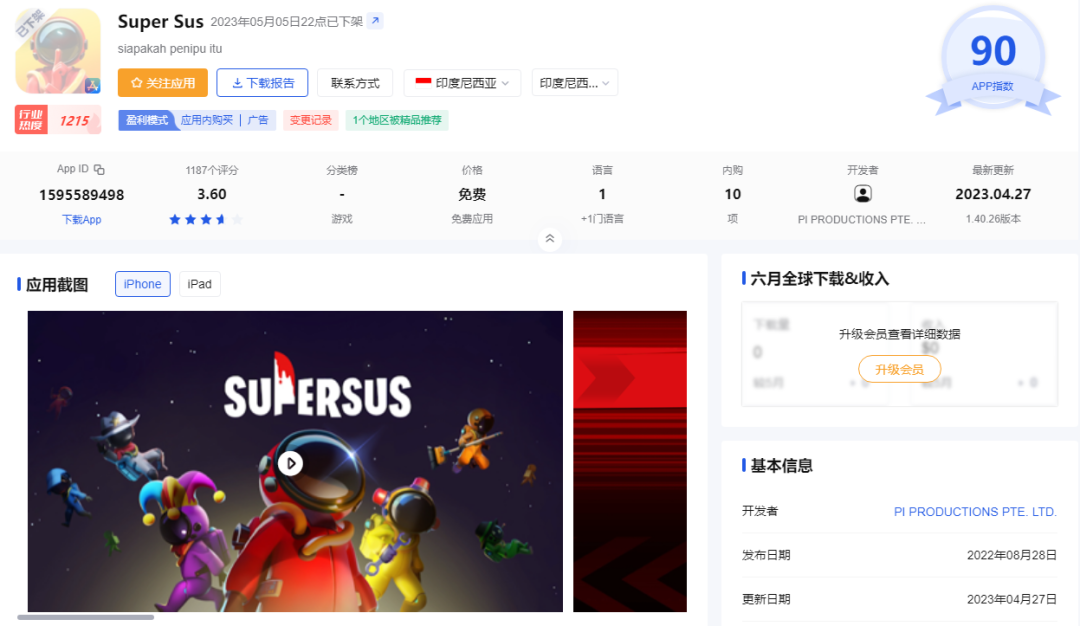 派对游戏《太空行动(Super Sus)》原本是巨人网络的出海先头兵。游戏在2021年底就开始在海外测试,次年年初游戏的日活跃用户破百万,目前在Google Play上的累计下载数超过5000万,游戏在东南亚等市场比较受欢迎。公司今年曾透露,游戏计划在今年下半年陆续开拓美国、日本等市场,但不久后其iOS版本就在印尼、马来西亚等市场下架。
