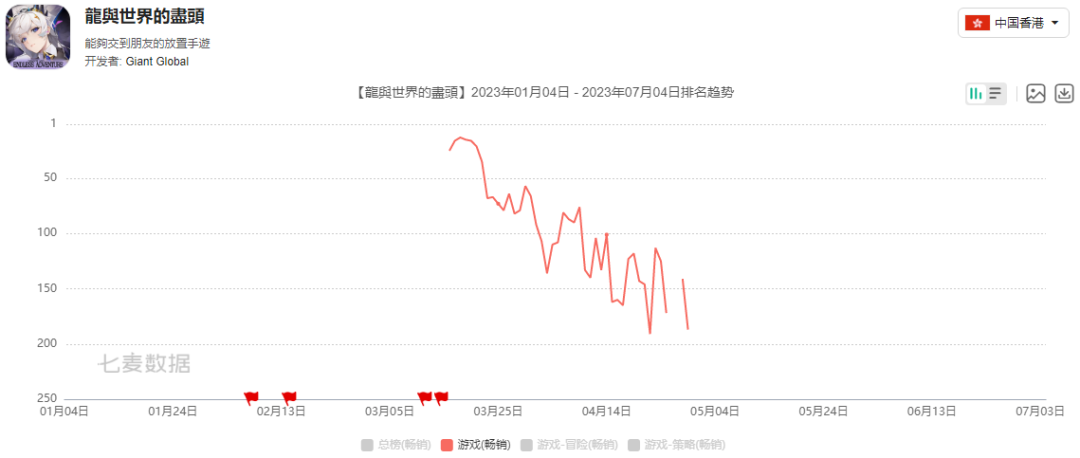 《龙与世界的尽头》原计划主攻东南亚市场,今年3月份在港澳台率先上线,2个月内就均下滑到iOS畅销榜200名开外。尽管游戏在研发过程中经历过大幅改动,项目在正式上线之后仍没有取得很好的成果,或许游戏会再次调整才考虑在东南亚市场上线。