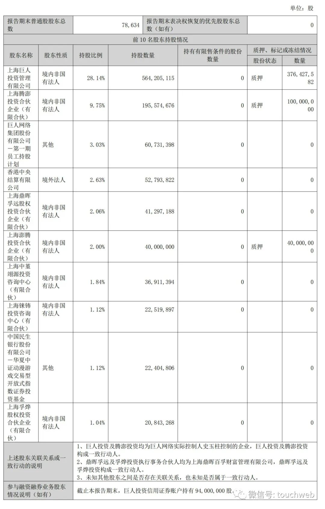截至2023年6月30日,上海巨人投资管理有限公司持股28.14%,上海腾澎投资合伙企业(有限合伙)持股为9.75%,巨人网络集团股份有限公司-第一期员工持股计划持股为3.03%,香港中央结算有限公司持股为2.63%,上海鼎晖孚远股权投资合伙企业(有限合伙)持股2.06%;上海腾澎投资合伙企业(有限合伙)持股2%;