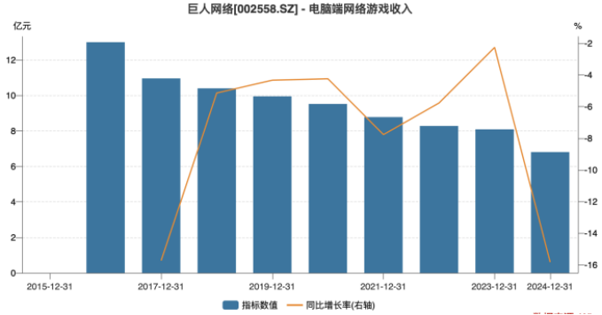 但营收增长趋势并未得到延续。2024年,巨人网络的收入再次回落。公司去年实现营业收入29.23亿元,同比下滑0.05%;归母净利润为14.25亿元,同比增长31.15%,出现增利不增收的情况。