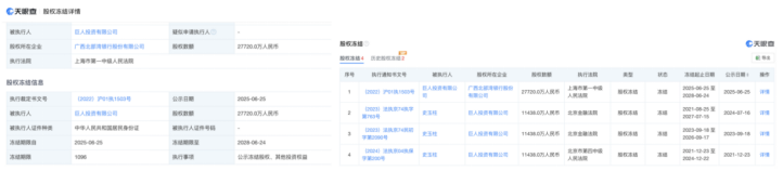 信息显示,6月25日,巨人投资股权所在企业广西北部湾银行股份有限公司,冻结股权数额约2.77亿元。此次冻结期限为三年,自2025年6月25日起至2028年6月24日止,由上海市第一中级人民法院执行。巨人投资为广西北部湾银行第二大股东,持股比例为5.636%。