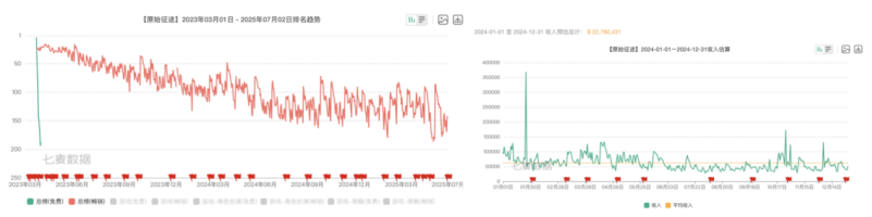 七麦数据显示,《原始征途》2023年3月24日上线当日在iOS总榜(免费)排名第四,但1个月不到便跌出200名;在畅销榜的排名整体处于下滑趋势,由上线首日的26名跌至目前的140名以下。同时,《原始征途》国服iOS端收入也出现大幅下滑。2024年,该游戏的收入预估为2278.04万美元,同比下滑56%。