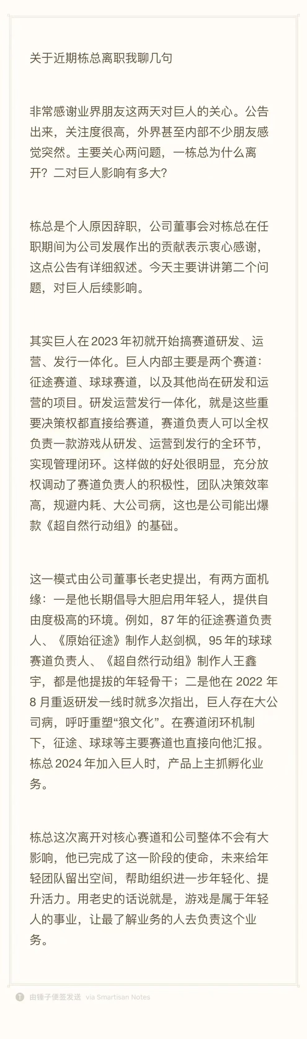 今日早间,巨人网络公关负责人马全智在社交媒体发布声明,表明:张栋的离职,不会对公司核心赛道和公司整体产生影响。同时表明,早在2023年,公司便坚持赛道研发、运营、发行一体化,在这样的“赛道闭环”机制下,不同赛道负责人直接向史玉柱汇报。公司将会坚持年轻化管理。