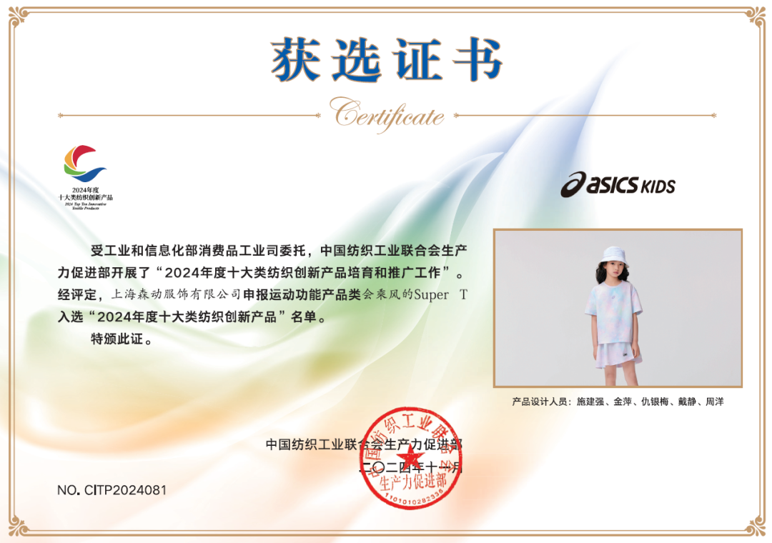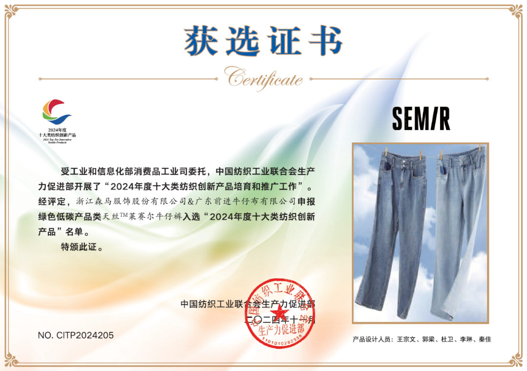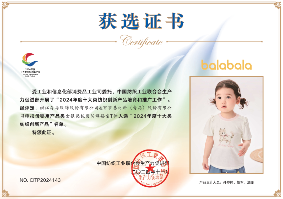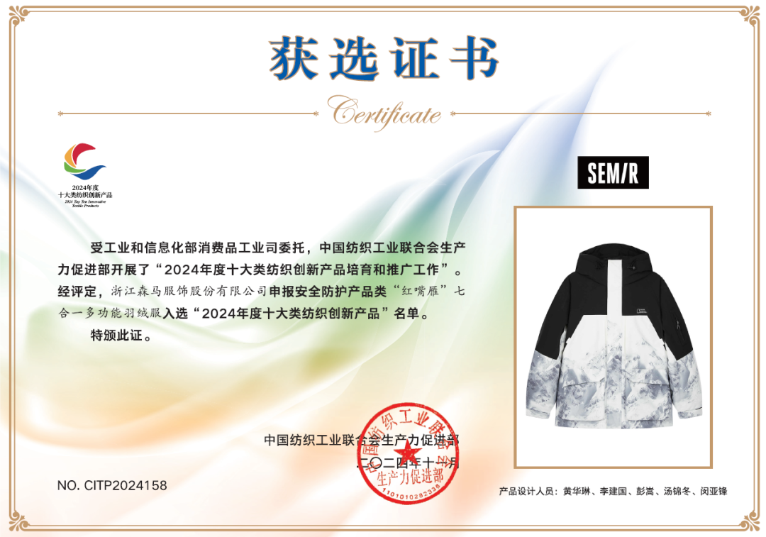 近期,根据中国纺织工业联合会公布的2024年度十大类纺织创新产品名单,森马服饰有四项产品脱颖而出,荣获十大类纺织创新产品奖,并且连续两年被评为“中纺联持续创新单位”。