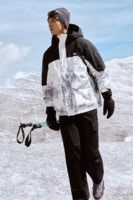 羽绒服主面料选用具备七大功能的环保聚酯纤维面料:防水、防油、防污、防风、透湿、耐磨、环境友好;经纱采用全消光再生聚酯纤维,赋予面料良好的仿棉效果,同时对环境更加友好,纬纱采用双组份弹力纤维,使面料的抗皱性能得到进一步提高;特氟龙纳米后整工艺,在纤维表面形成一层保护膜,赋予面料洗前洗后良好的防水、防油、防污效果;面料贴合功能性3K/4K膜,让面料有较好的防风保暖性能,同时具有一定的透湿性能。